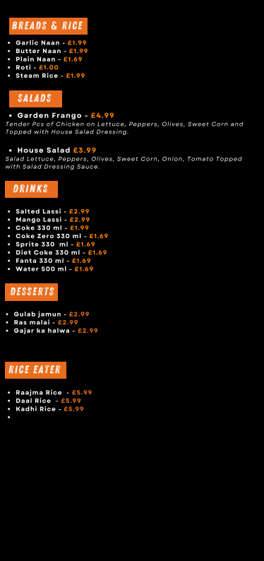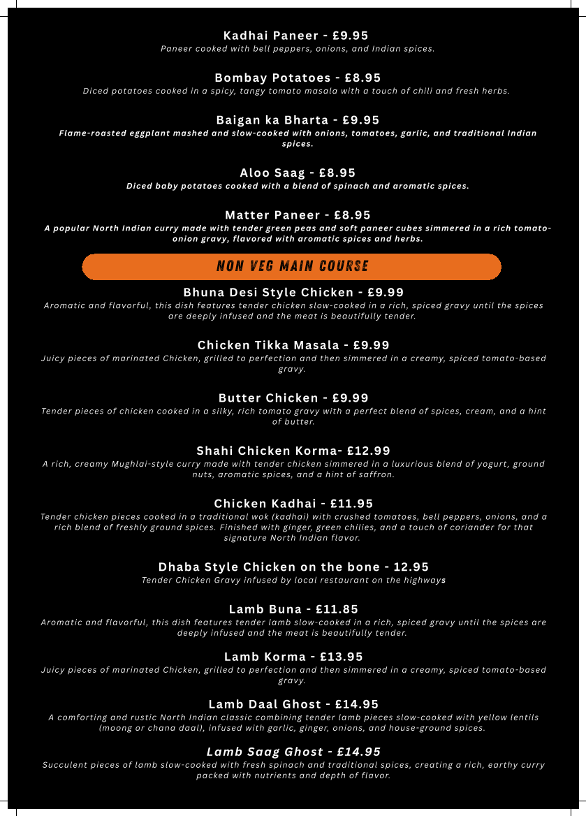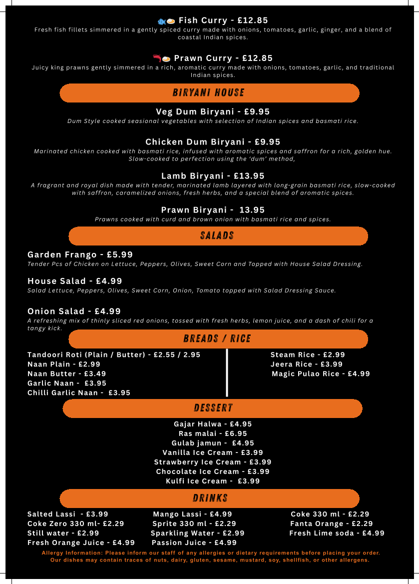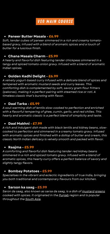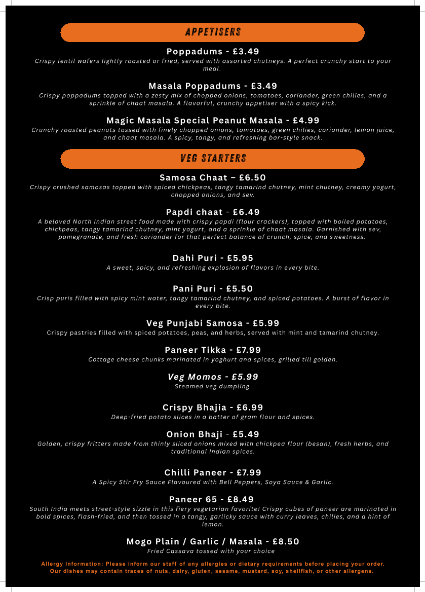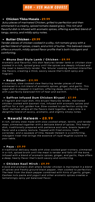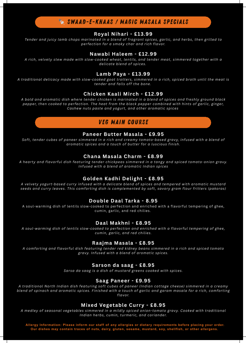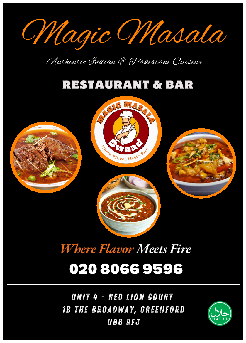 Magic Masala Greenford offers a diverse and flavorful menu, providing something for every taste. The starters range from light and crispy options like Poppadums and Masala Poppadums to more robust dishes such as the Magic Masala Special Peanut Masala. For those craving a vibrant vegetarian experience, the Samosa Chaat and Papdi Chaat bring a tangy kick, while the Dahi Puri and Pani Puri offer refreshing bites. The main courses shine with Royal Nihari, Nawabi Haleem, and Lamb Paya, each packed with rich, complex flavors. Vegetarians can enjoy the comforting Paneer Butter Masala and the hearty Chana Masala Charm or explore the delightful Golden Kadhi Delight. Non-vegetarians will savor dishes like Chicken Samosa, Lamb Seekh Kebab, and Lamb Chops, while the Chicken Kaali Mirch and Kadhai Paneer offer a spicy punch. For rice lovers, the Veg Dum Biryani and Chicken Dum Biryani are aromatic and satisfying. When it comes to bread and rice, options such as Garlic Naan and Tandoori Roti complement any dish perfectly. To round off the meal, indulge in rich desserts like Gajar Halwa, Ras Malai, or Gulab Jamun, with refreshing drinks such as Mango Lassi or Coke Zero providing the ideal beverage to accompany your meal.