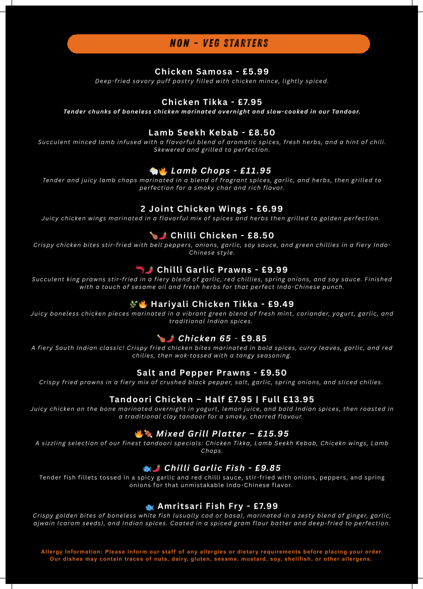 A sizzling selection of our finest tandoori specials: Chicken Tikka, Lamb Seekh Kebab, Chicekn wings, Lamb Chops.