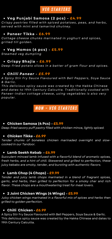 Crispy poppadums topped with a zesty mix of chopped onions, tomatoes, coriander, green chilies, and a sprinkle of chaat masala. A flavorful, crunchy appetiser with a spicy kick.